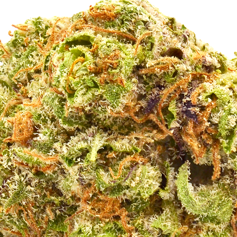 The buds are thick and resinous, looking almost sparkly due to the trichome layer. The colas are dense and compact, with green tones and bright orange pistils. Upon breaking open the bud or during your first inhale, you can expect a potent, fuel-like aroma with wet paint and kushy and earthy undertones.